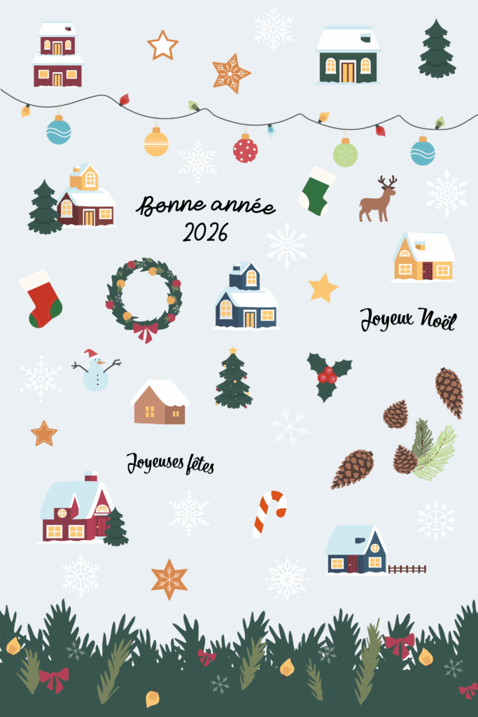 flocons, ambiance hivernale, sapins de noël, animaux des montagnes, paysages enneigés, lettrages lumineux…